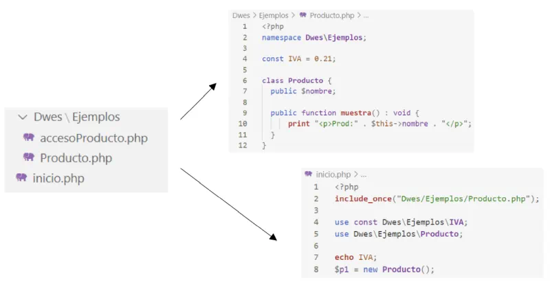 Por ejemplo, si queremos utilizar la clase \Dwes\Ejemplos\Producto desde un recurso que se encuentra en la raíz, por ejemplo en inicio.php, haríamos: